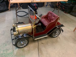 The morning was spent on the vintage car, which to our eye, just needed cleaning and some air in the tyres, but with all the years of dust in all nooks and crannies in the ornate brass fittings took time, and then lets talk tyres. Each tyre was cleaned, and not just the side walls, but the tread as well. By the end the car was gleaming and ready for display. Keith took some pictures and then it was parked with a pedal bus and covered to be next seen on the display.