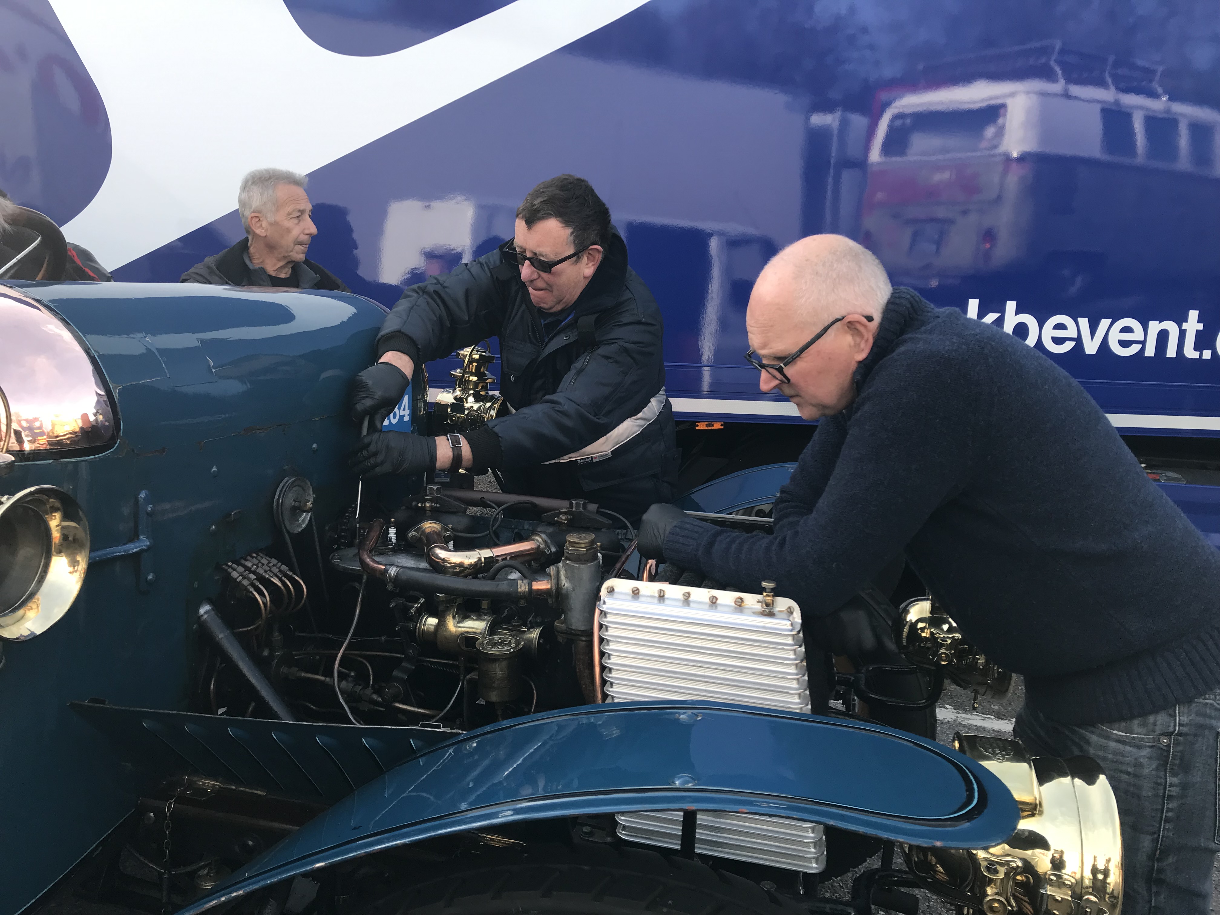 Soon the water was topped up – after a suitable cooling period – and after removing the engine cover, several Beaulieu engineers including Doug and Stan set about the engine. We made use of toilets and a welcome cup of coffee and I tucked into the breakfast box provided by the hotel in lieu of breakfast. We were delayed about an hour; although the Daimler was running better, there was still an issue present to affect performance. Fortunately, the engine was pronounced good enough to continue the journey with Doug at the wheel for the final stint.