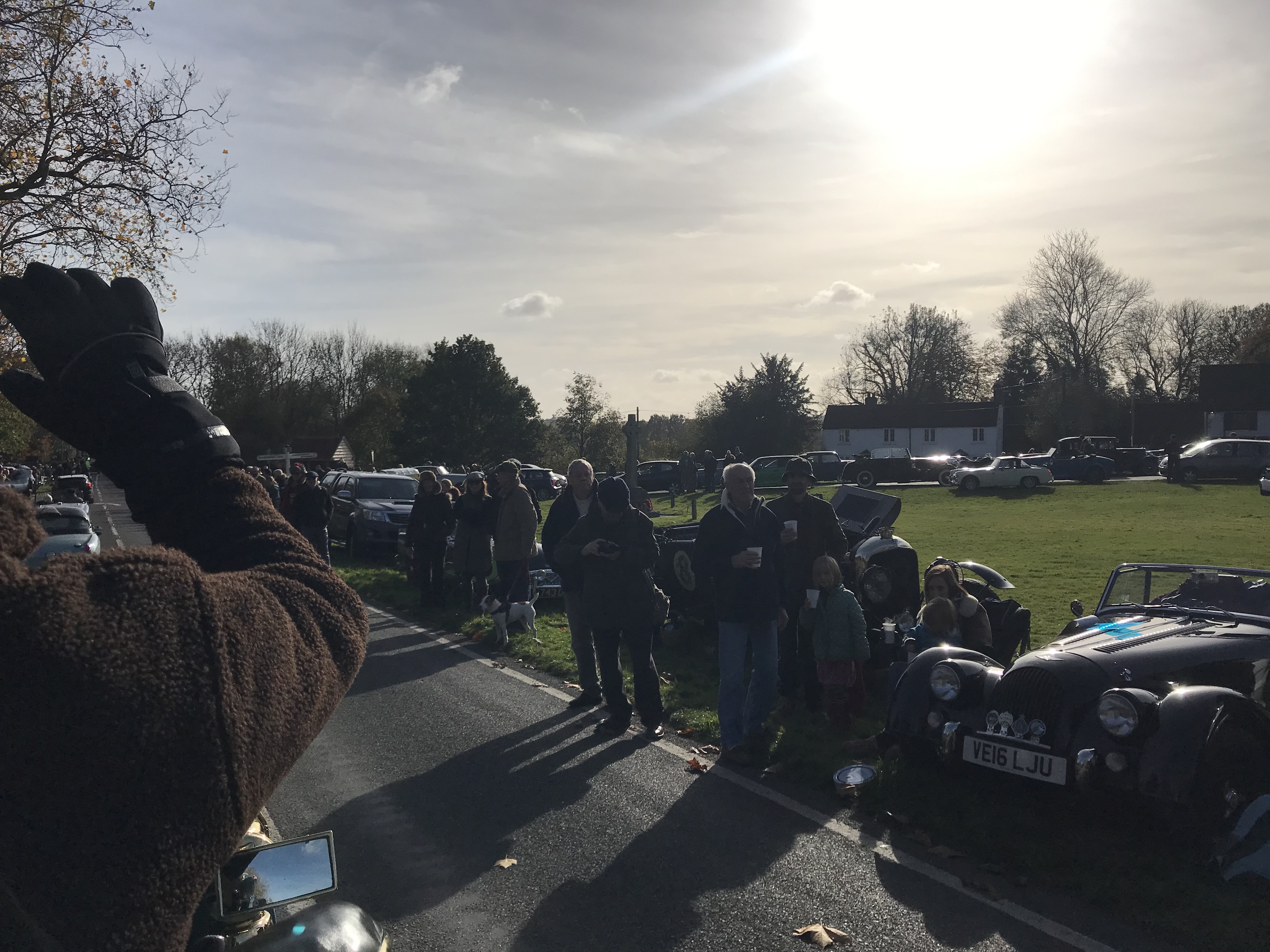 My friends David and Frances Ackland live close to the route at Coulsdon and were waiting outside the ‘Full Monty’ café. Frances said, ‘We waited nearly 1.5 hours for you with the smell of frying bacon drifting by from the Full Monte café’. As we approached, Frances broke into a frantic arm-waving dance and we exchanged waves and mouthed greetings. David meantime snapped the Daimler’s approach and the picture were soon posted on social media.